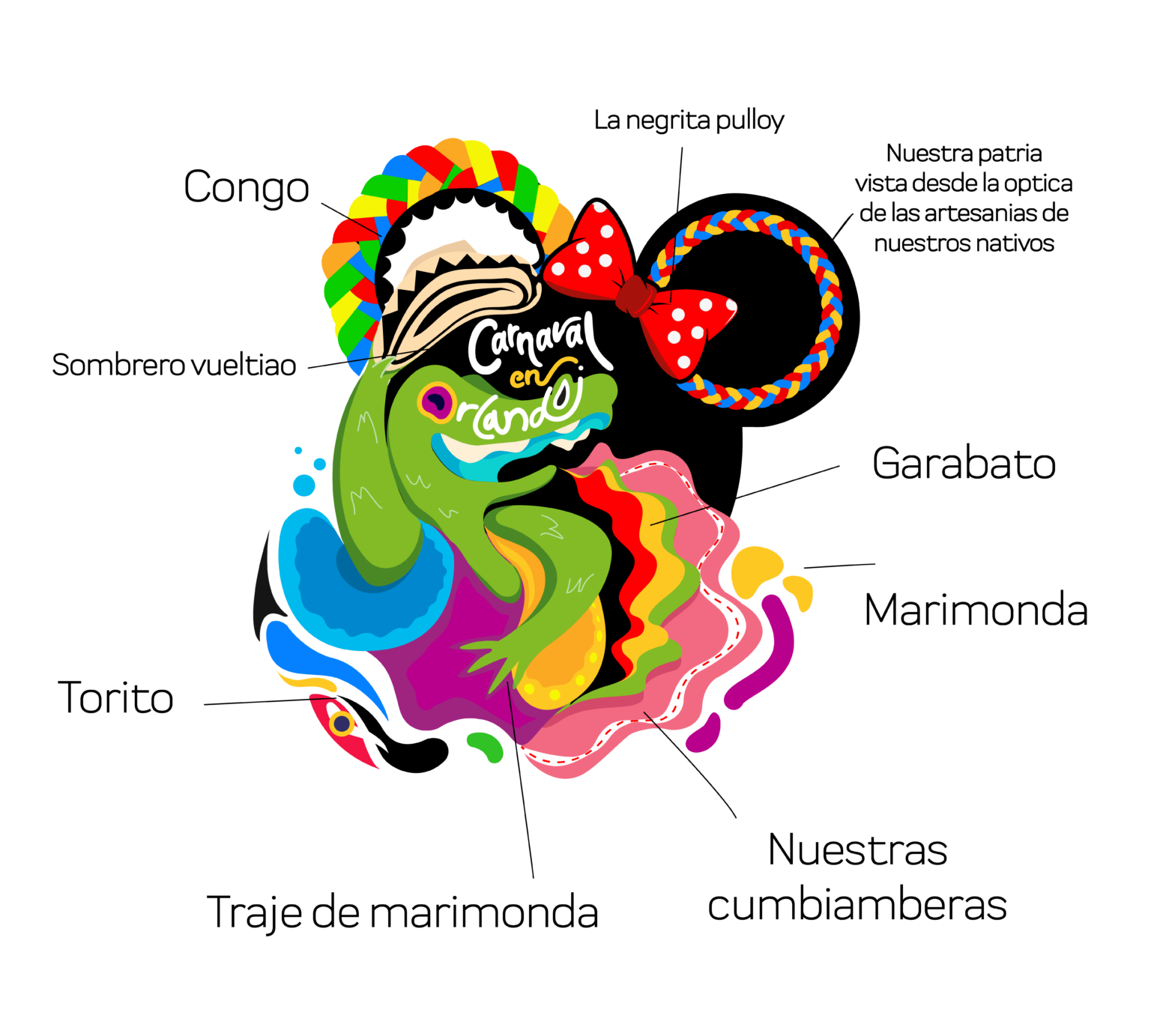 Nuestra MARCA representa el orgullo de los elementos naturales y de fauna que tienen en comun BARRANQUILLA Y ORLANDO, tales como, sol, cuerpos de agua, caiman y atracciones turisticas. Queremos que sea una insignia para los amantes del carnaval y sientan la energia de su fiesta y su gente al observar dicha marca, pero tambien que nos sintamos cerca de nuestra tierra amada.